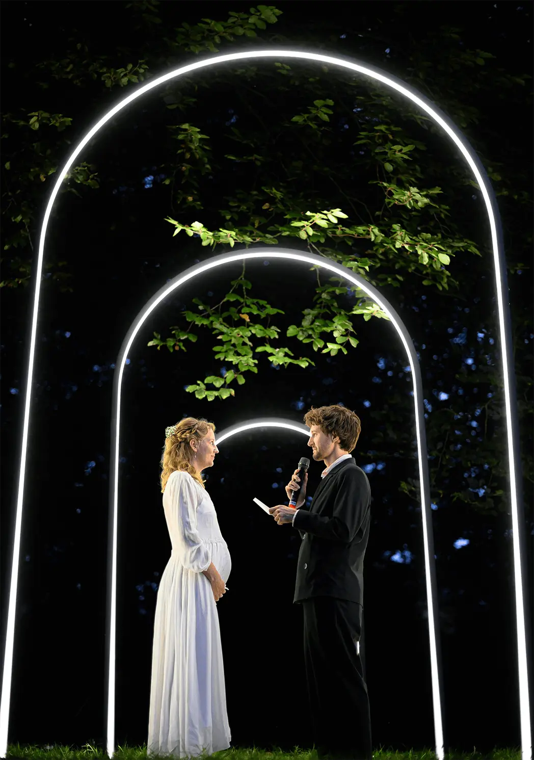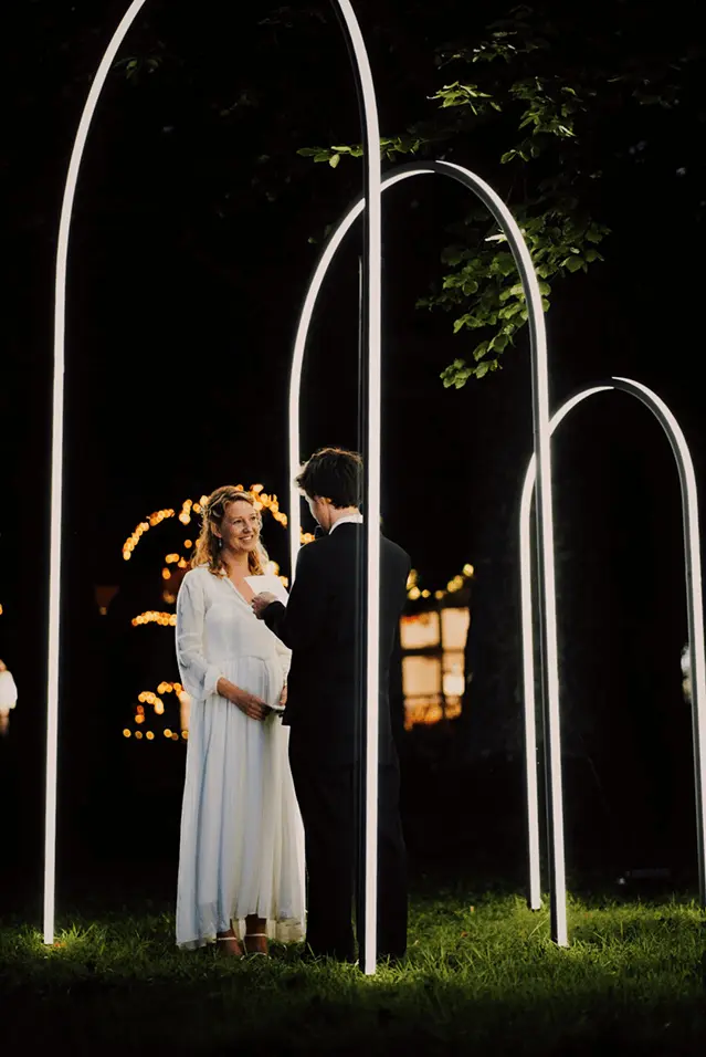 "De lichtbogen sloten perfect aan bij de magie van de schemering. Het was alsof ze mee ademden met de energie van de ceremonie. Absoluut het hoogtepunt van het evenement!"